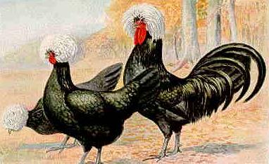 | The mature white crested black polish represent a striking contrast in color with their body plumage of lustroust black and crests of white with a few black feathers. The little chicks are cunning with their bodies and white "top hats".You will be delighted with these lovely and interesting chickens which are useful as well as attractive. |